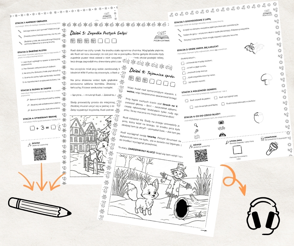 Dopełnieniem każdej karty jest audio-nagroda. Kod QR to nie tylko dodatek technologiczny, ale ważny element budujący motywację. To moment, w którym dziecko odkłada ołówek, zamyka oczy i słucha, jak historia ożywa.